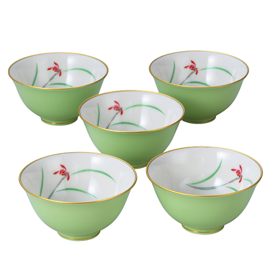 内側に描かれた美しい蘭の花と、外側の淡いグリーンの落ち着いた色合いが上品な湯呑揃です。