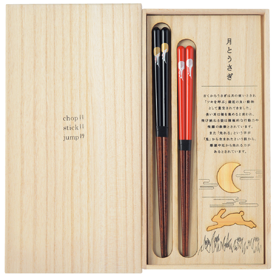前脚が短く、後ろ脚が長く大きいうさぎは、坂を登る事が速いので物事がトントン拍子に進むとか、うさぎの長い耳は福を集めるなどといわれ、縁起の良いお箸です。