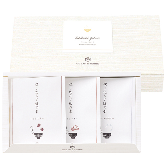 - 商品内容 ●内容:炊き込みご飯の素 38g(2合用)×3、はまぐり 2個×1、ずわい蟹 13g×1、うなぎの蒲焼き 13g×1、三つ葉 0.2g×3、白煎りごま 1g×3 ●賞味期間:製造日より180日 ●化粧箱:25.5 x 14 x 4.5cm ●アレルゲン:小麦・かに