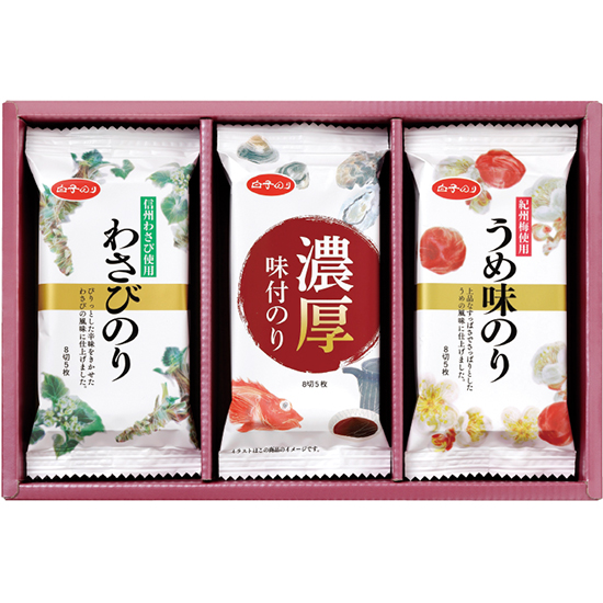 - 商品内容 ●内容:信州わさび使用わさびのり×2、濃厚味付のり×2、紀州梅使用うめ味のり×2 各(8切5枚) ●賞味期間:製造日より18ヶ月 ●化粧箱:25.5 x 4.5 x 17cm ●アレルゲン:小麦・えび