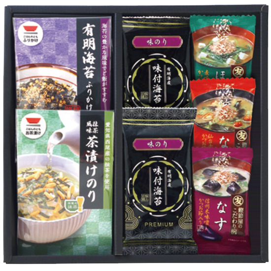 - 商品内容 ●内容:有明海苔ふりかけ 2P×1、抹茶入のり茶漬け 2P×1、有明海産味付海苔 (8切5枚)×2、即席味噌汁(ほうれん草×1、なめこ×1、茄子×1) ●賞味期間:製造日より300日 ●化粧箱:28.5 x 28.5 x 4.5cm ●アレルゲン:小麦・えび