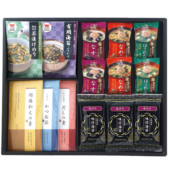 - 商品内容 ●内容:抹茶入のり茶漬け 2P×1、有明海苔ふりかけ 2P×1、胡麻和えの素 (4g×2)×1、かつお節 (1.5g×2P)×1、かつお風味だしの素 (4g×3P)×1、即席味噌汁(茄子×2、なめこ×2、ほうれん草×2)、有明海産味付海苔 (8切5枚)×3 ●賞味期間:製造日より300日 ●化粧箱:37.5 x 44.5 x 3.7cm ●アレルゲン:小麦・乳・えび