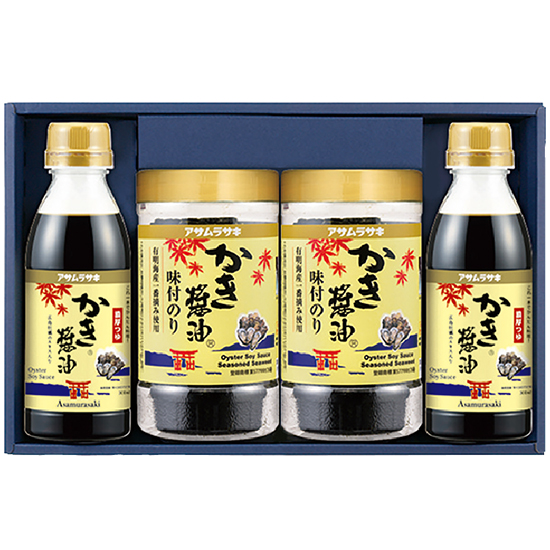 - 商品内容 ●内容:かき醤油 300ml×2、かき醤油味付のり (8切30枚)×2 ●賞味期間:製造日より360日 ●化粧箱:30 x 19.5 x 8cm ●アレルゲン:小麦・えび