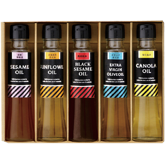 - 商品内容 ●内容:胡麻香味油×1、ひまわり油×1、黒胡麻油×1、EXVオリーブオイル×1、なたね油×1 各90g ●賞味期間:製造日より365日 ●化粧箱:18.5 x 25.5 x 5.2cm
