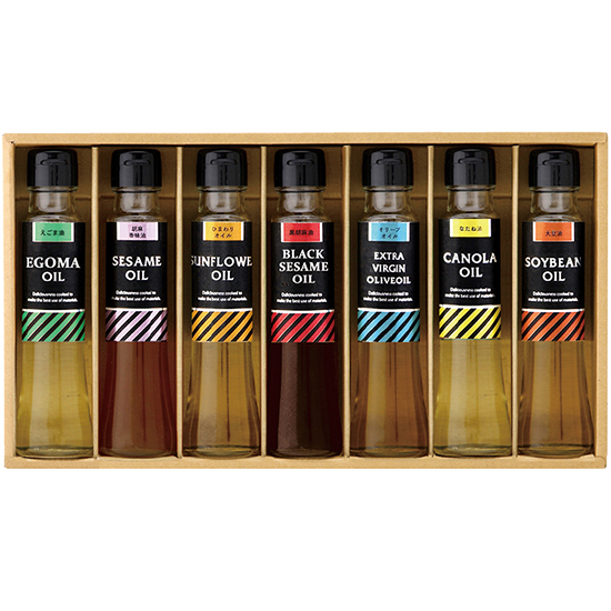 - 商品内容 ●内容:えごま油×1、胡麻香味油×1、ひまわり油×1、黒胡麻油×1、EXVオリーブオイル×1、なたね油×1、大豆油×1 各90g ●賞味期間:製造日より365日 ●化粧箱:21 x 37 x 5.2cm