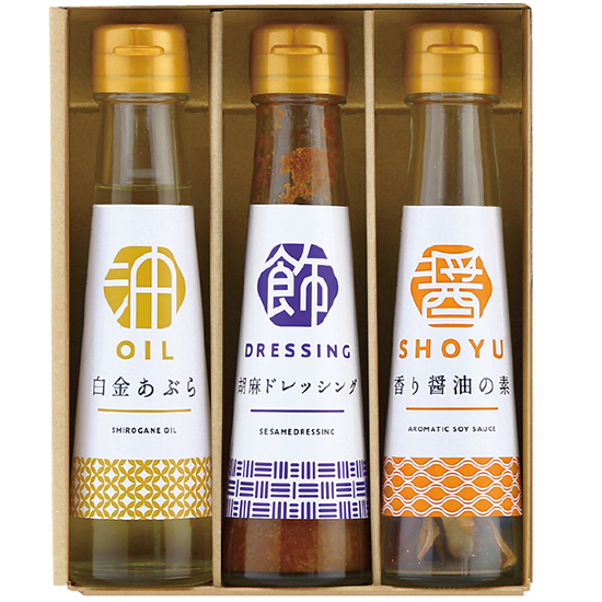 - 商品内容 ●内容:白金あぶら 90g×1、胡麻ドレッシング 100ml×1、香り醤油の素 4.5g×1 ●賞味期間:製造日より365日 ●化粧箱:18.5 x 15.5 x 5.2cm ●アレルゲン:小麦