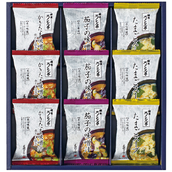 - 商品内容 ●内容:かきたま味噌汁赤だし仕立×3、茄子の味噌汁×3、たまごスープ×3 ●賞味期間:製造日より360日 ●化粧箱:25 x 26 x 3.2cm ●アレルゲン:小麦・たまご