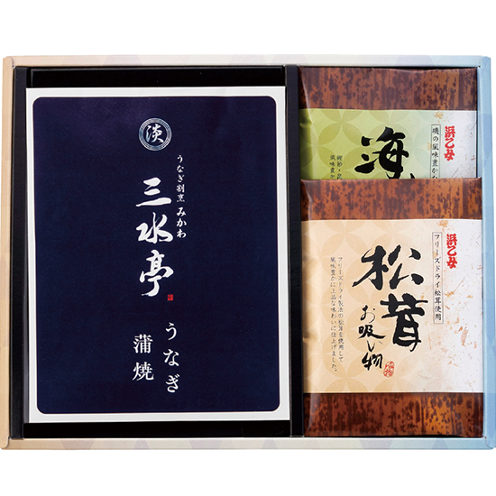 - 商品内容 ●内容:三水亭三河一色産うなぎの蒲焼半身×1、浜乙女松茸お吸物(2袋入) ×1、海苔お吸物(2袋入) ×1 ●賞味期間:製造日より240日 ●化粧箱:26.3 x 21.5 x 4cm ●アレルゲン:小麦