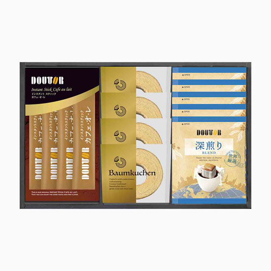- 商品内容 ●内容:バウムクーヘン×4、ドトールカフェ・オ・レ 9.5g×4、ドトールドリップコーヒー深煎りブレンド 7g×5 ●箱:32×20.3×6cm ●賞味期限:製造日より360日 ●アレルゲン:小麦・卵・乳