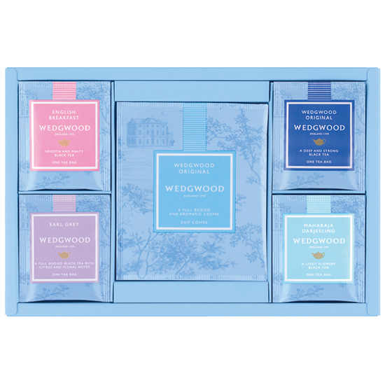 ウェッジウッド人気のティーバッグ4種にオリジナルドリップコーヒーをセット。ちょっとひと息つきたい時にオススメのセットで紅茶好き・コーヒー好きに分かれる家庭にも贈りやすいひと品です。