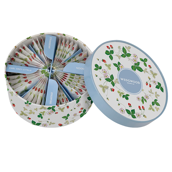 ウェッジウッドの代表パターン「ワイルド ストロベリー」をモチーフにしたかわいらしい円柱パッケージに入った4種類のアソートティーバッグです。ちょっとしたお返しや手土産、ホワイトデーや母の日のプレゼントにもオススメのひと品です。