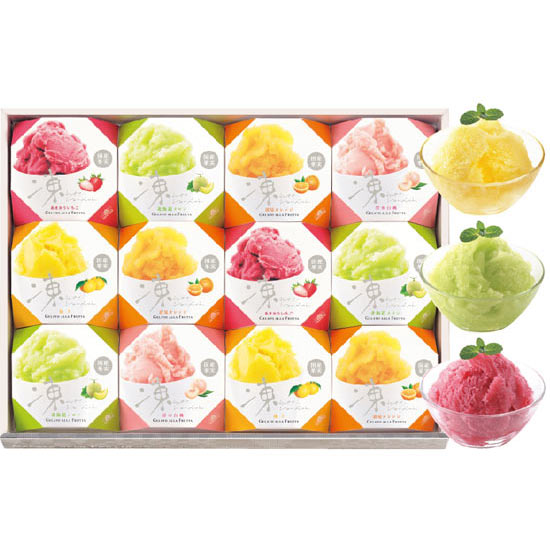 - 商品内容 ●内容/凍らせてシャーベット(清見オレンジ・北海道メロン:各66g×3、あまおういちご・柚子・清水白桃:各66g×2) ●化粧箱:36.5x27.5x4.3cm ●賞味期間:製造日より180日