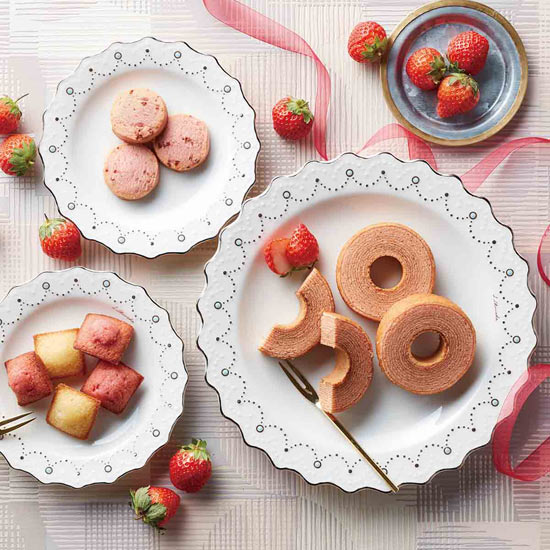 国産小麦粉とあまおう苺濃縮果汁を使用し、苺の風味と味わいを生かして一層一層丁寧に焼き上げたバウムクーヘンと、ひとくちサイズのしっとりとした食感で仕上たフィナンシェ、ほろろとした食感とフリーズドライのいちごを使用したざくっとした食感のアイスボックスクッキーの詰め合わせです