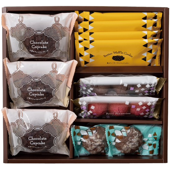 - 商品内容 ●内容:2層のチョコカップケーキ×3、焼きショコラ×4、焦がしバターワッフルクッキー×4、プチフィナンシェ3個入(ショコラ×1P、フランボワーズ×1P) ●賞味期間:製造日より90日 ●化粧箱:28 x 26.2 x 4.3cm ●アレルゲン:小麦・たまご・乳