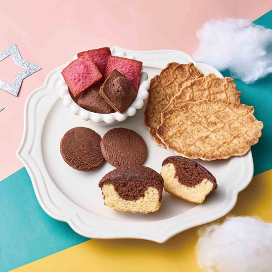 ふんわり2層のチョコカップケーキ、ホロっしっとり新食感なブラウニー、焦がしバター香るキャラメリゼされたワッフルクッキー、いろどりプチサイズのフィナンシェ。楽しさ詰まった魅惑のお菓子たちで食べあう人に笑顔の時間をプレゼントします。 チョコをきっかけに魅惑の遊園地へトリップさせてくれる『CHOCOTRIP』からの贈り物。