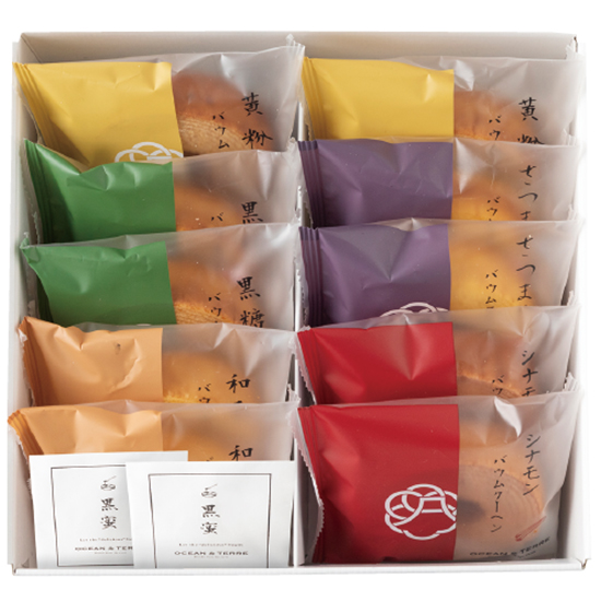 - 商品内容 ●内容:黄粉バーム×2、黒糖バーム×2、シナモンバーム×2、さつま芋バーム×2、和栗バーム×2、黒蜜10g×2 ●賞味期間:製造日より120日 ●化粧箱:20.5 x 21.3 x 10.5cm ●アレルゲン:小麦・たまご・乳