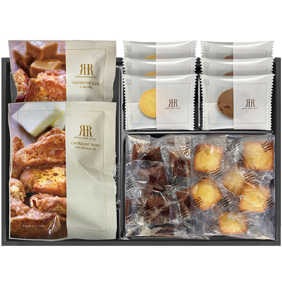 - 商品内容 ●内容:クロワッサンラスク(シュガーバター風味×1、キャラメル×1)、プチフィナンシェ(プレーン 6P×1、ショコラ 6P×1)、クッキー(プレーンバニラ×3、チョコチップ×3) ●賞味期間:製造日より90日 ●化粧箱:22 x 32 x 6cm ●アレルゲン:小麦・たまご・乳
